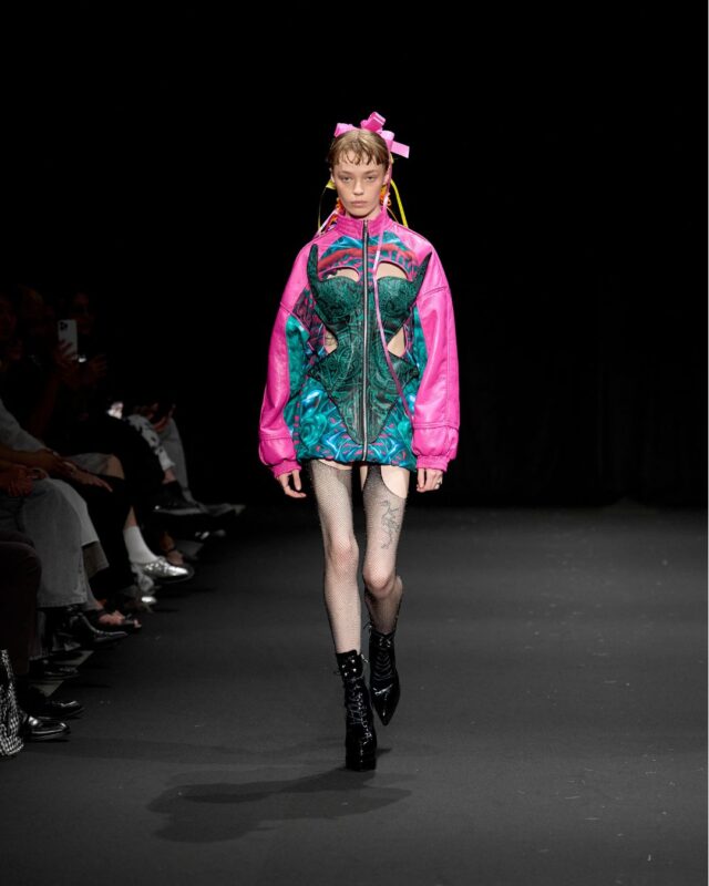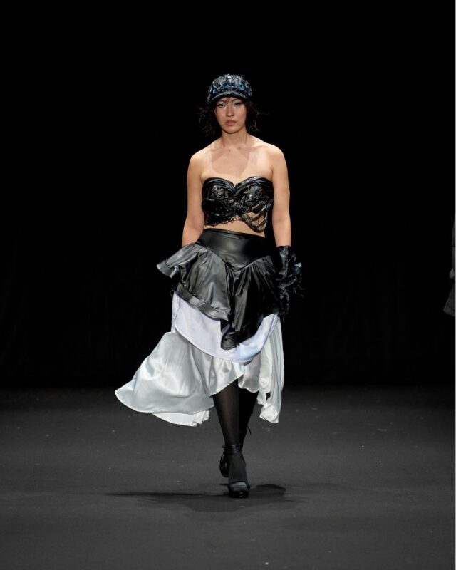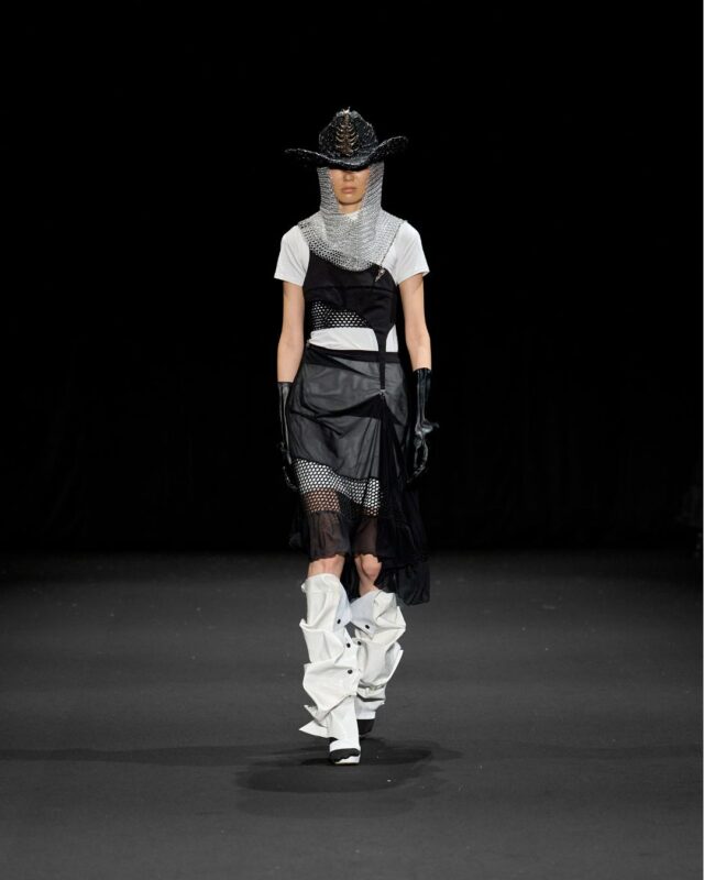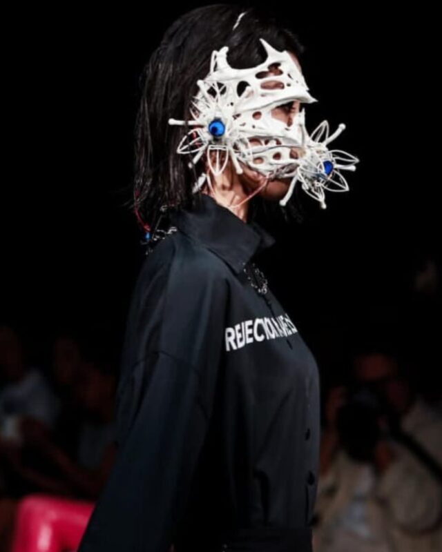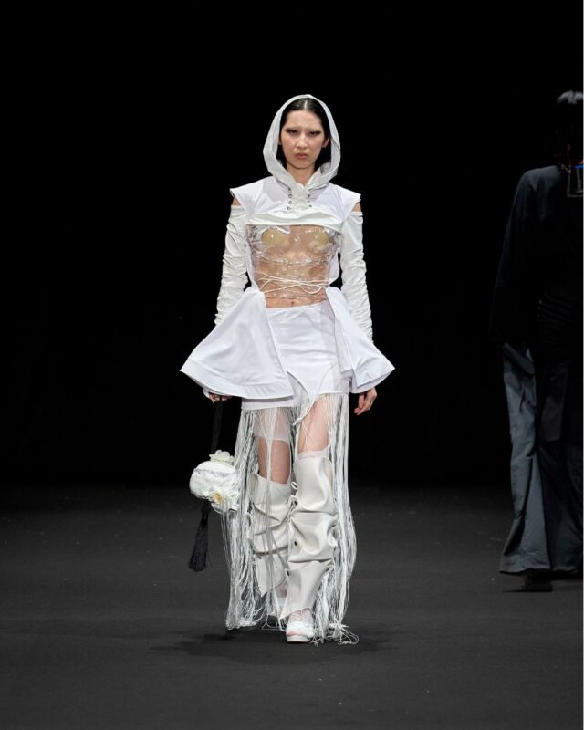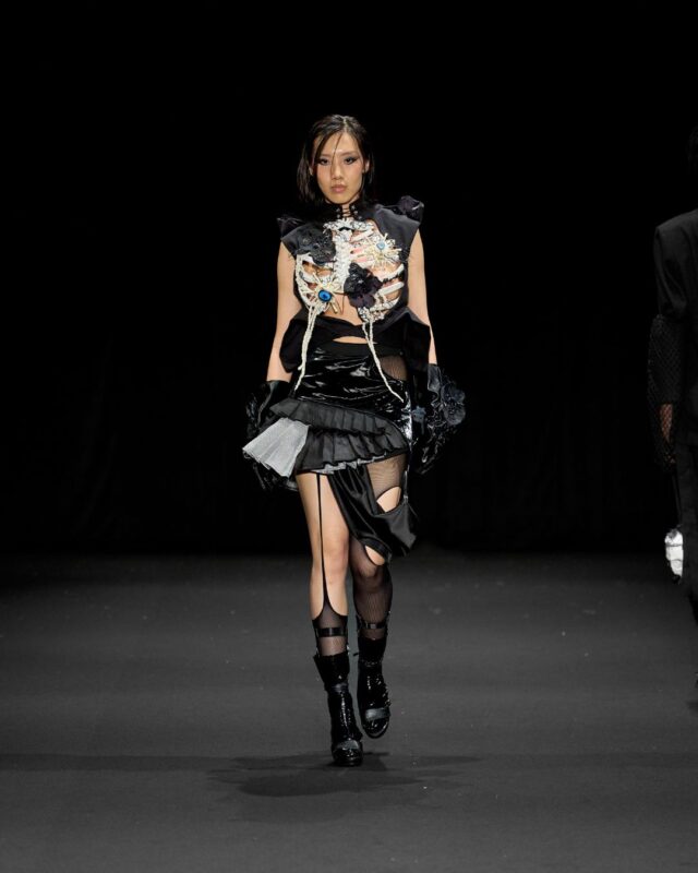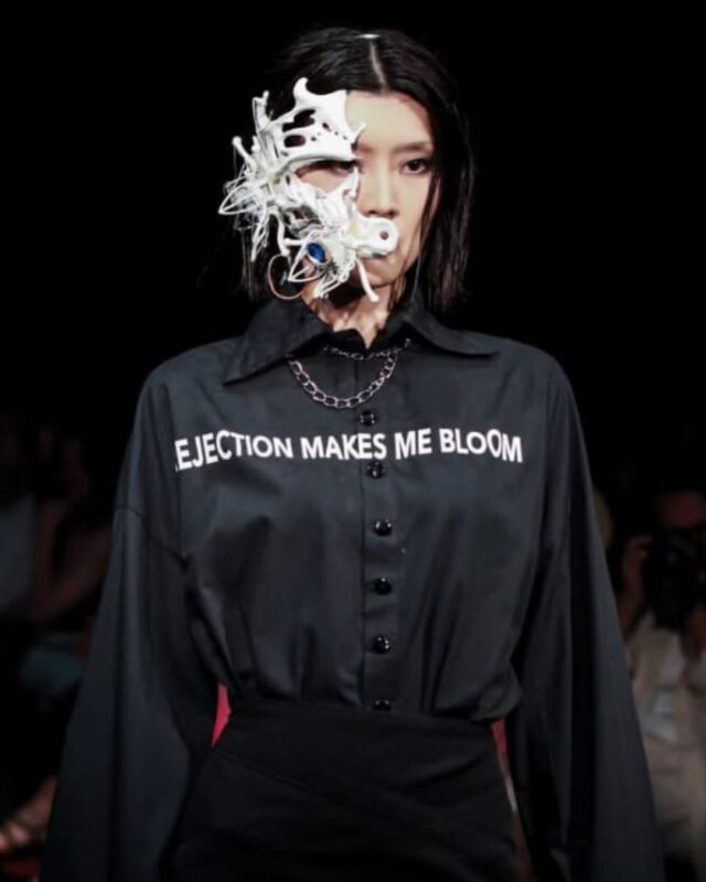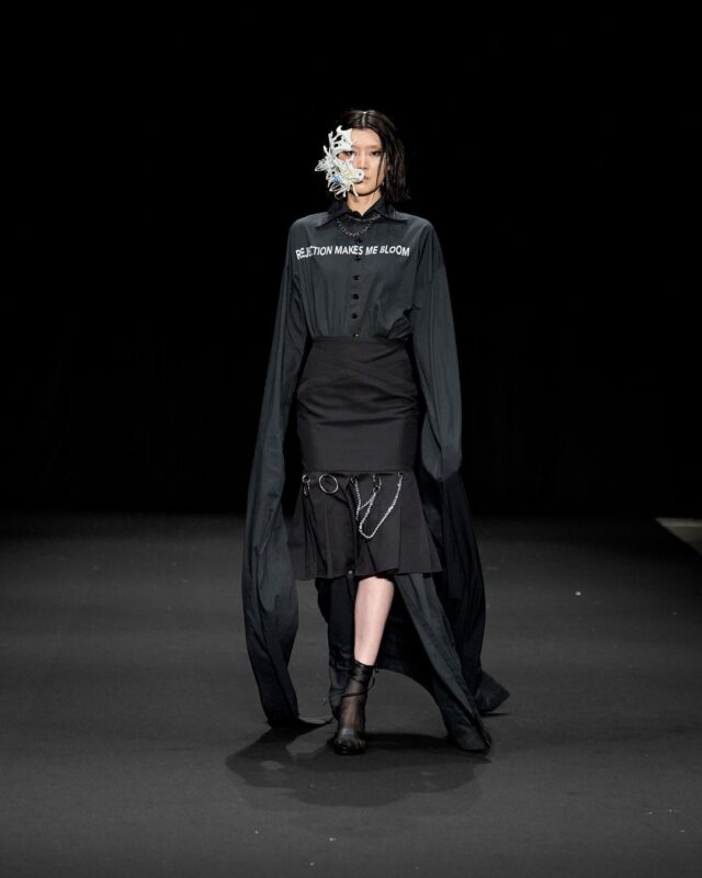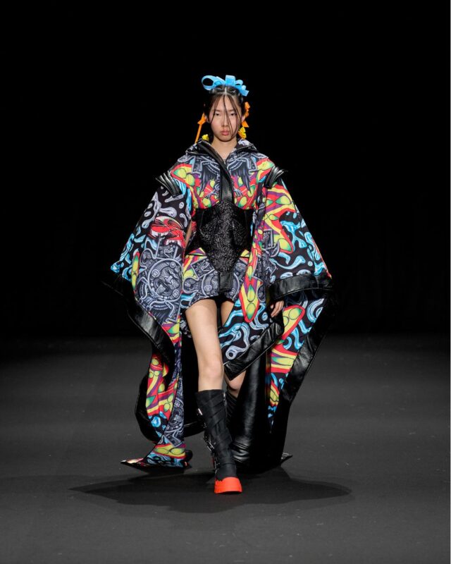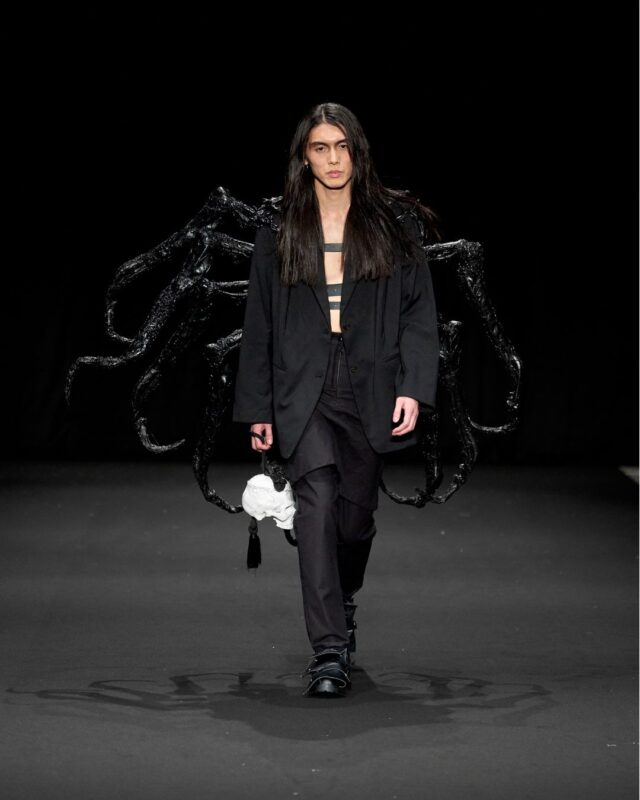 Por su parte, Elizabeth Salim llevó a Tokio una propuesta conceptual con su colección titulada Hanahaki, inspirada en la enfermedad ficticia que hace florecer los pulmones a causa de un amor no correspondido, la diseñadora trasladó esa metáfora al terreno ecológico, preguntándose qué ocurriría si la Tierra decidiera no corresponder más a la humanidad. El resultado fueron doce looks que exploraron la intersección entre el pensamiento japonés con referencias al bukimi, ese inquietante sentimiento de perfección artificial y el surrealismo mexicano.