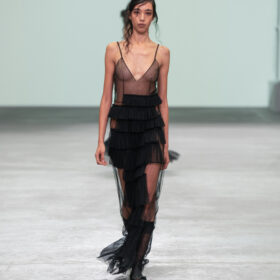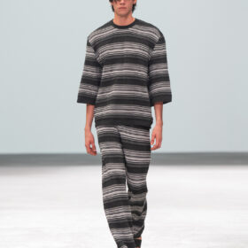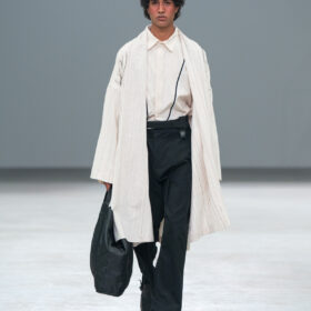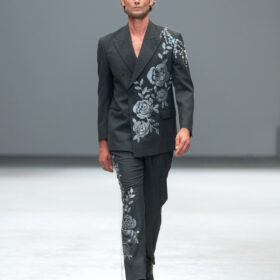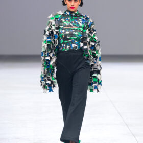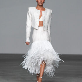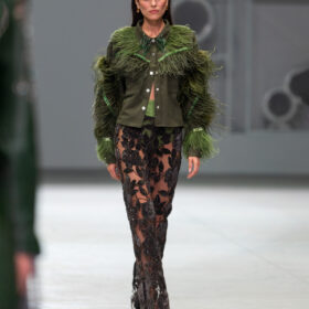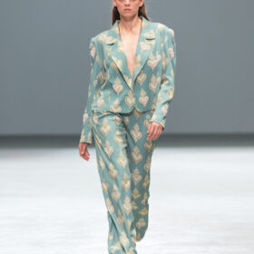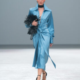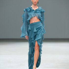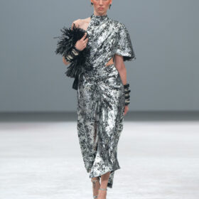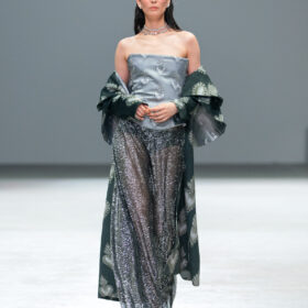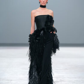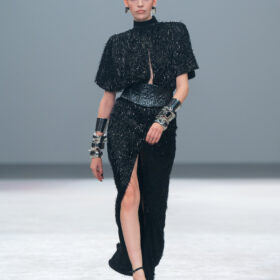 Guillermo Vargas, director creativo de 1/8 Takamura, presentó Carnaval, una colección que se mueve en el umbral entre la oscuridad y la luz, un espacio donde todo está en transformación. El desfile combinó plumas, flores, lentejuelas y cuerpos en movimiento, generando una sensación de energía colectiva y celebración.