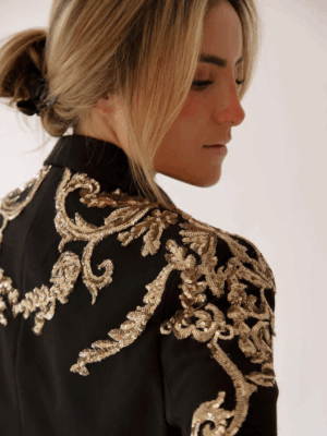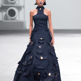 El mar fue su punto de partida: un territorio fértil donde todo se mueve, cambia y renace. Bordados hechos con cristales de candelabros antiguos, botones vintage y materiales rescatados del pasado dieron vida a una estética de reinvención. La paleta se movió entre negros carbón, azules profundos y tonos cálidos como cobre y lava. Reflejan libertad creativa que reafirma su voz sin miedo a lo incierto.