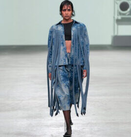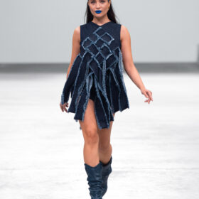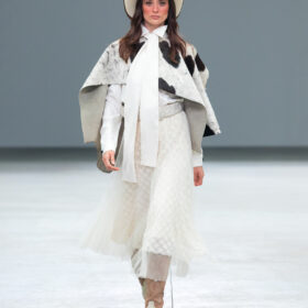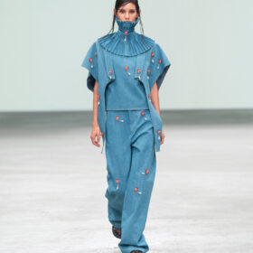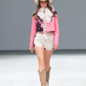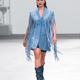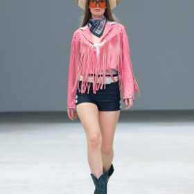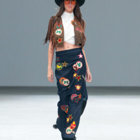 Denim, piel, encaje, bordados y detalles couture se combinan para equilibrar la rudeza vaquera con la delicadeza de cada silueta. La colección da forma a un western couture que dialoga con la tradición y el presente, mostrando una visión contemporánea de la estética vaquera.
