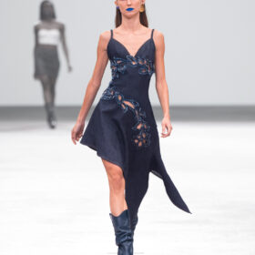 El denim se reinventa con incrustaciones de cristales Swarovski, bordados luminosos y sastrería oversize que convive con siluetas fluidas y detalles dramáticos. Tonos metálicos, pasteles suaves y texturas satinadas dialogan con organza, mesh y linos frescos, creando un universo visual de luz y movimiento. El negro, trabajado en terciopelos líquidos y transparencias estratégicas, sirve como lienzo para constelaciones de Swarovski que iluminan escotes, mangas y espaldas abiertas. La propuesta construye una narrativa de elegancia escénica, sensualidad y presencia luminosa, muy al estilo Josefina.